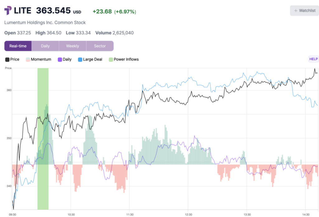 Lumentum Holdings Inc (NASDAQ: LITE) experienced a significant Power Inflow alert, a key bullish indicator that is closely tracked by traders who value order flow analytics, specifically institutiona...
